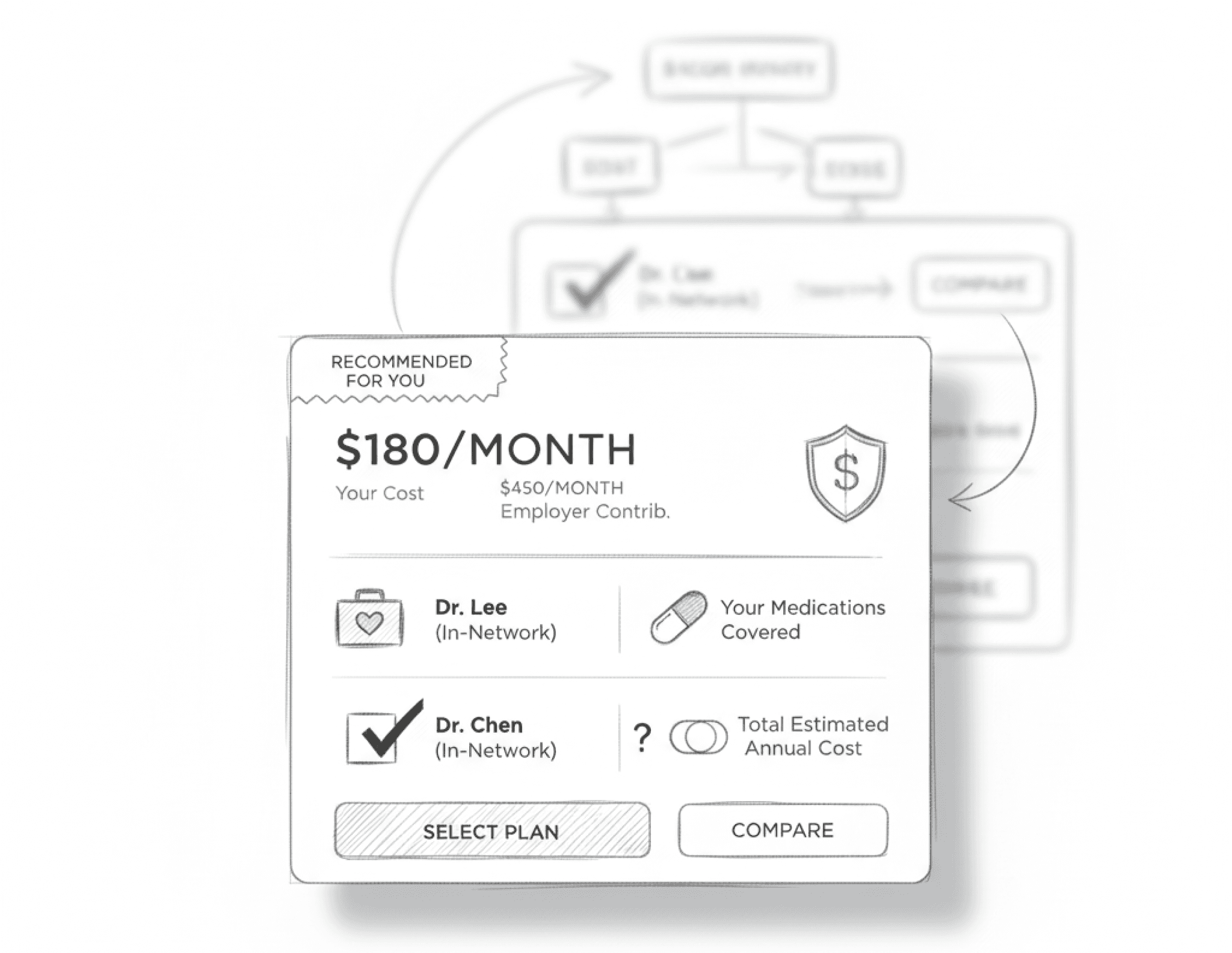 The "One-Size-Fits-All" Trap: Traditional group plans don't account for individual health history. We needed a UI that could recommend plans based on the user's specific data (medications, doctors, etc.).