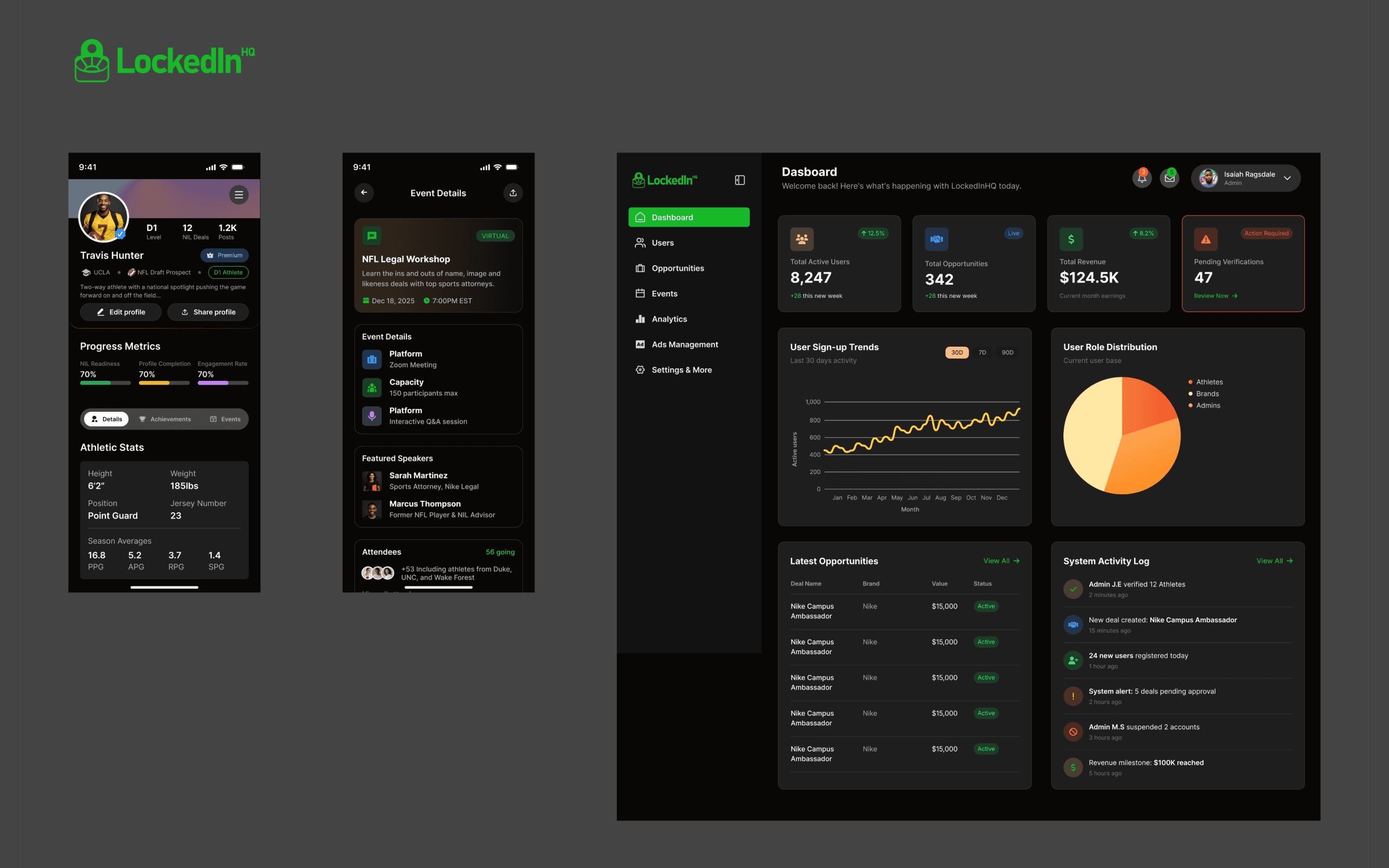 LockedInHQ App Profile screen , Opportunity details screen and admin dashboard UI